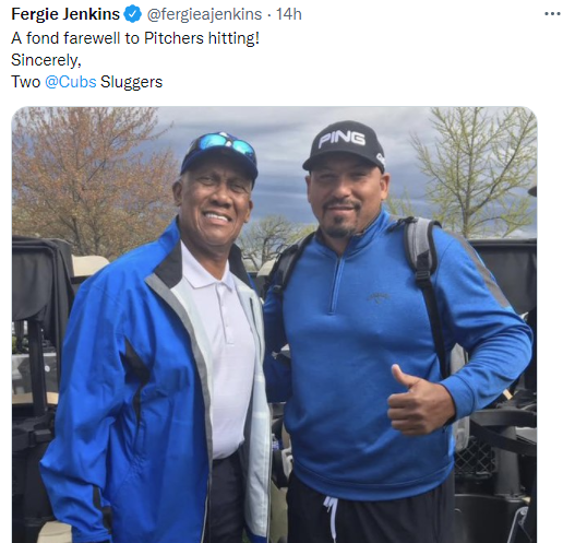 -I’ve often written about Canadian pitching legend Fergie Jenkins’ batting prowess. In his 1971 Cy Young Award-winning season, the Chatham, Ont., native belted six home runs. That number was equaled by Cubs pitcher Carlos Zambrano in 2006, but it still stands as the record for most by a Cubs pitcher in a season. And with the new universal DH rule, it’s a record that will likely stand forever. Jenkins posted this fun photo of him with Zambrano on Twitter on Friday.