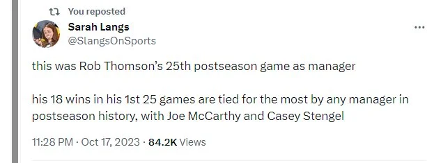 -Also, this week, Sarah Langs, of the MLB Network, offered another tweet after the Phillies’ second win of the NLCS that illustrates just how well the club has performed under Thomson in the postseason.