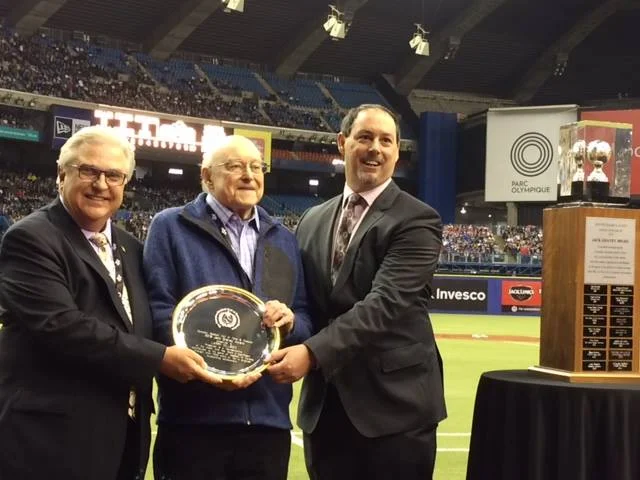 Canadian Baseball Hall of Fame board members John Starzynski and David Morneau presented longtime Globe & Mail scribe and Toronto Blue Jays beat writer Larry Millson with the Hall’s Jack Graney Award in a ceremony between innings during the Blue Jays’ 6-4 win over the Pittsburgh Pirates at Olympic Stadium yesterday.