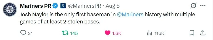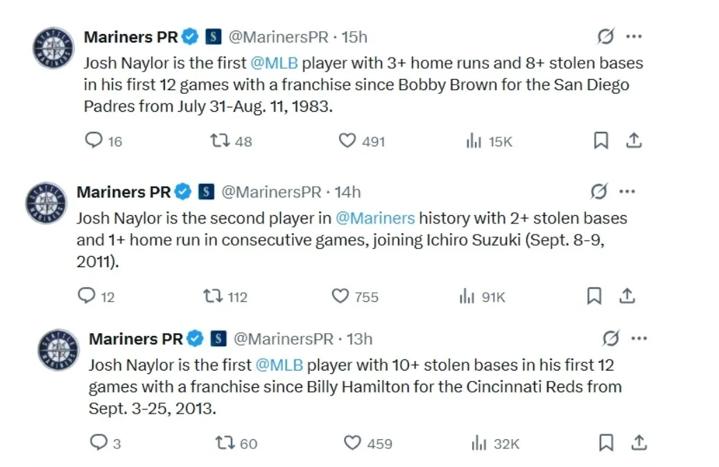 For an encore, Naylor clubbed another homer and swiped two more bases in the M’s 8-6 win over the White Sox on Wednesday. That performance inspired this flurry of tweets from the Mariners’ PR team: