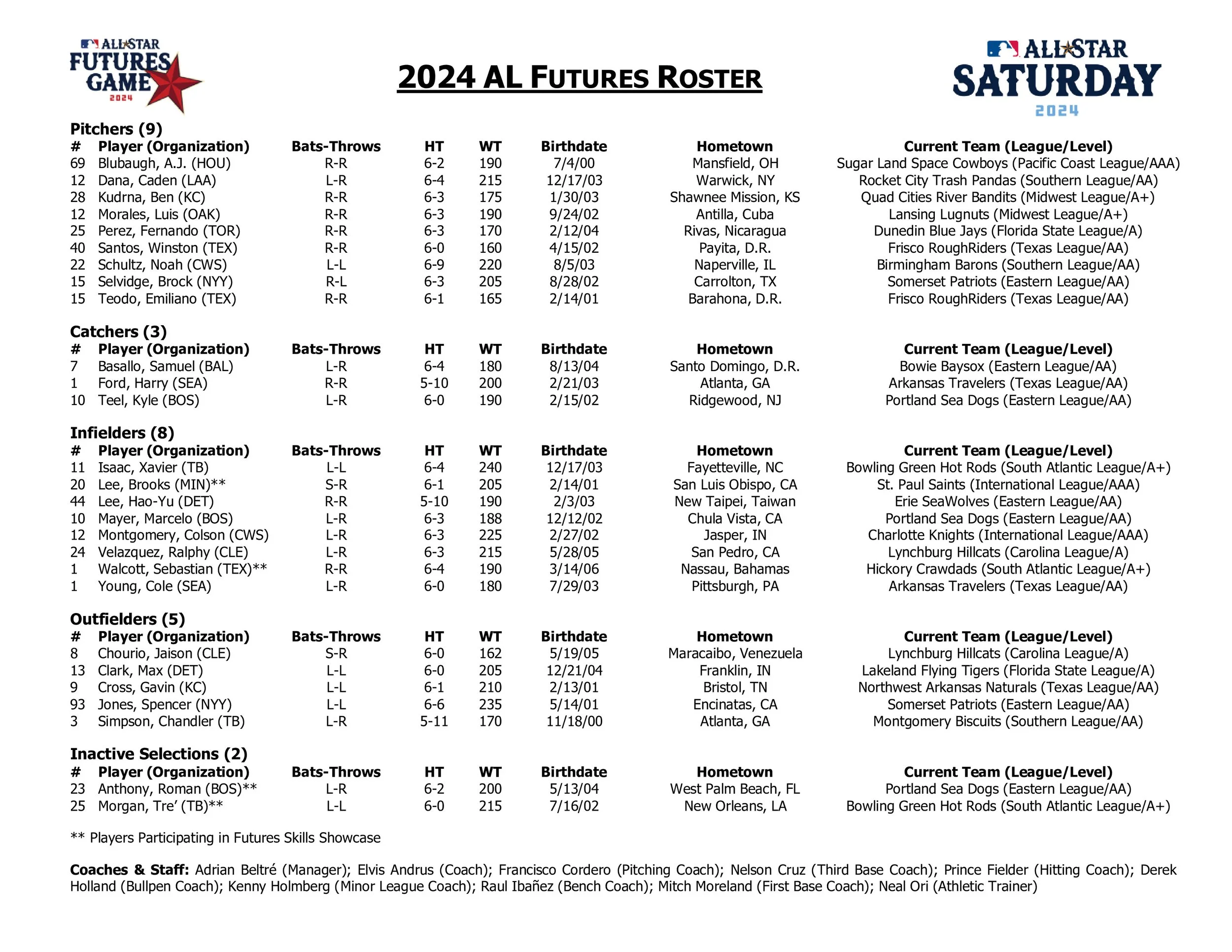 -Eight players who have participated in Development Programs led by MLB and USA Baseball are featured on the Futures rosters, including Cam Collier (Breakthrough Series, DREAM Series, Hank Aaron Invitational); Justin Crawford (Breakthrough Series, DREAM Series, Hank Aaron Invitational); Harry Ford (DREAM Series); Tink Hence (Breakthrough Series, DREAM Series); Termarr Johnson (Breakthrough Series, DREAM Series, Hank Aaron Invitational); Druw Jones (DREAM Series); Tre’ Morgan (Breakthrough Series, DREAM Series, Hank Aaron Invitational); and Chandler Simpson (Breakthrough Series).