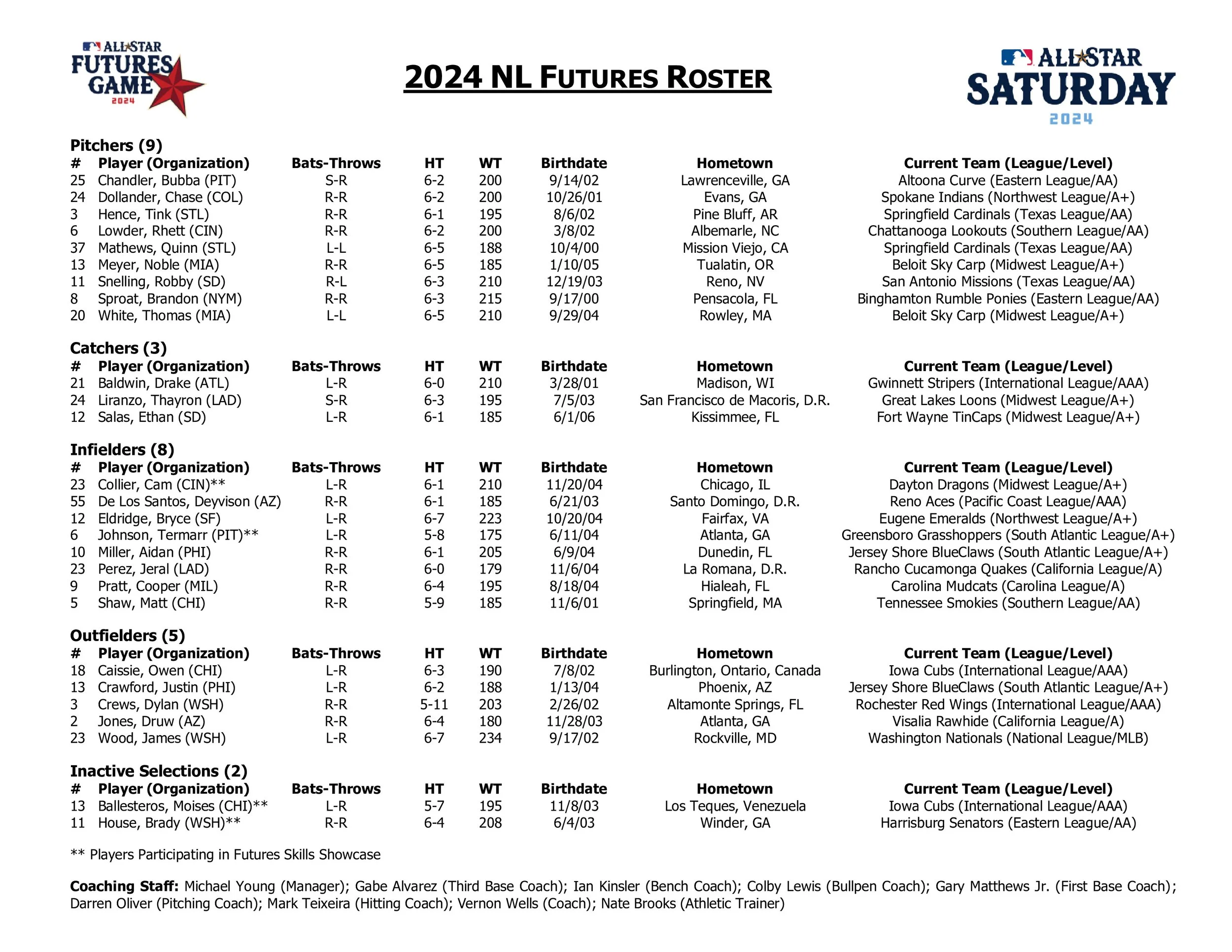 Each of the last two number two overall picks in the MLB Draft – Washington’s Dylan Crews (2023) and Arizona’s Druw Jones (2022) – are part of the NL Futures roster. Crews, who is MLB Pipeline’s number four overall prospect, and Jones, who is ranked third by MLB Pipeline in the Diamondbacks’ organization, are joined by 10 fellow first round draft picks on the NL roster, including Pittsburgh’s Termarr Johnson (4th overall, 2022); Cincinnati’s Rhett Lowder (7th overall, 2023); Colorado’s Chase Dollander (9th overall, 2023); Miami’s Noble Meyer (10th overall, 2023); Washington’s Brady House (11th overall, 2021); Chicago’s Matt Shaw (13th overall, 2023); San Francisco’s Bryce Eldridge (16th overall, 2023); Philadelphia’s Justin Crawford (17th overall, 2022); Cincinnati’s Cam Collier (18th overall; 2022); and Philadelphia’s Aidan Miller (27th overall, 2023).