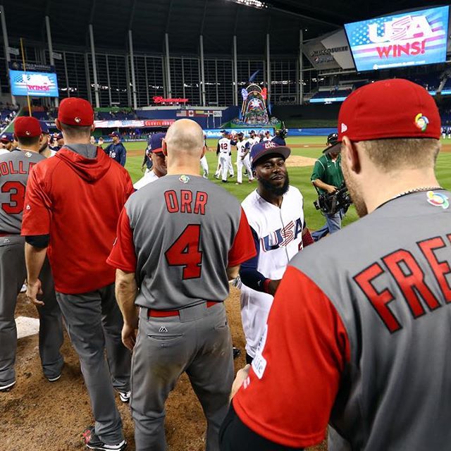 Canuck players in the first base dugout watched. Catcher Buster Posey went to shake hands with Jones and one by one Team USA players still in the field exchanged high-fives and then were congratulated by the bench players, manager Jim Leyland and his staff after the 8-0 win over Canada before 22,303 at Marlins Park.