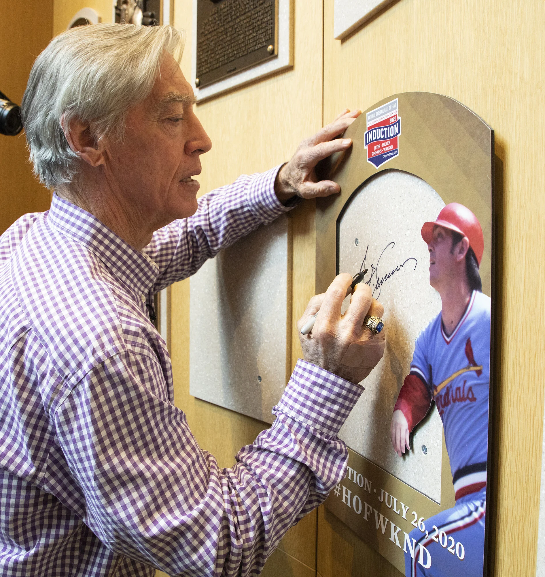 Ted Simmons signs behind where his plaque will be hung at the National Baseball Hall of Fame in Cooperstown. Simmons was elected to the National Baseball Hall of Fame by the Modern Baseball Era Committee. Photo: National Baseball Hall of Fame