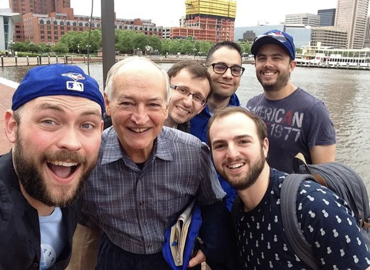 Former Blue Jays broadcaster Jerry Howarth posing for a photo with a group of Jays fans outside Camden Yards in Baltimore. Photo: Mike Meehan