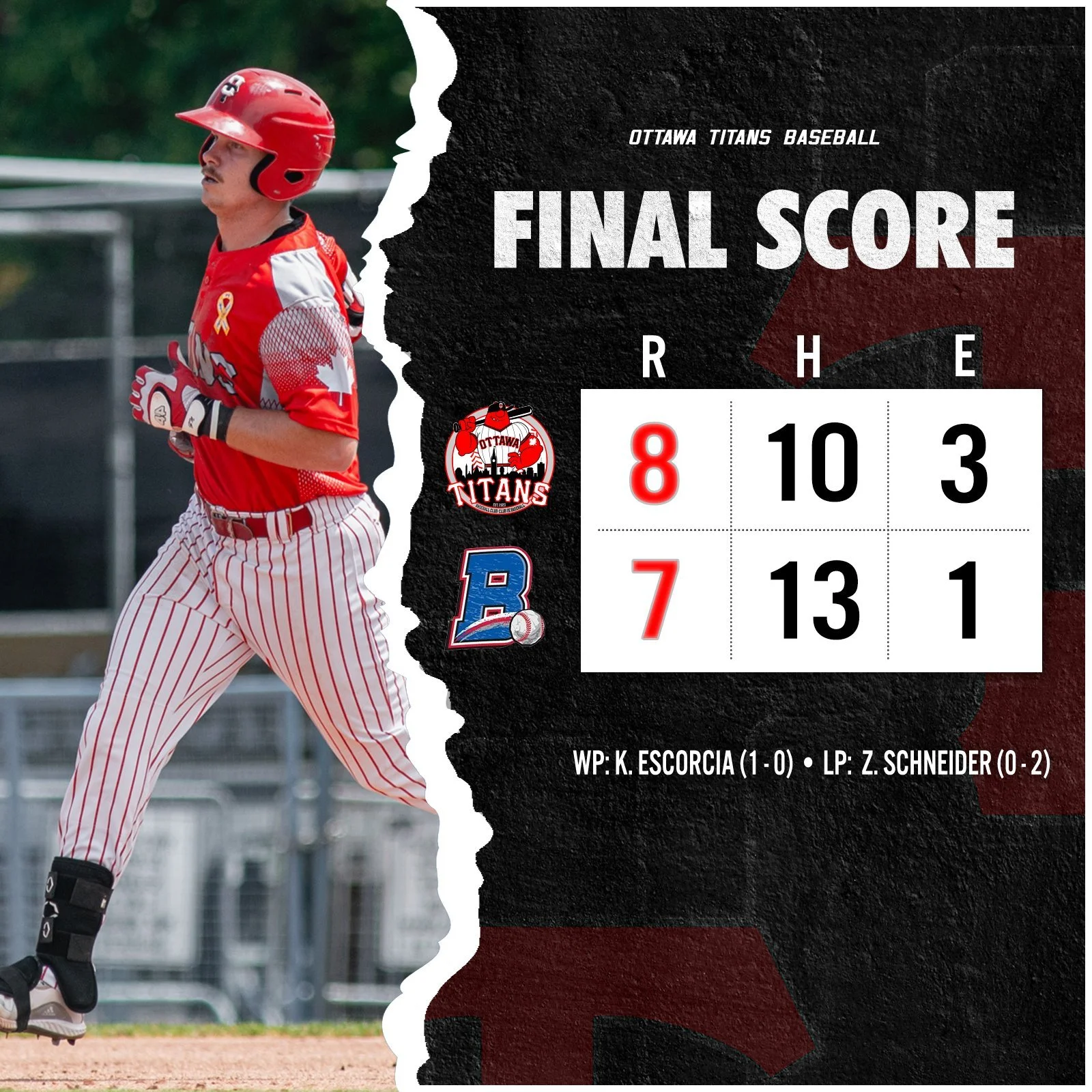 Ottawa, Ont. - The Ottawa Titans (25-11) trailed on three separate occasions on Sunday but managed to walk off the New York Boulders with an 8-7 victory in 10 innings.