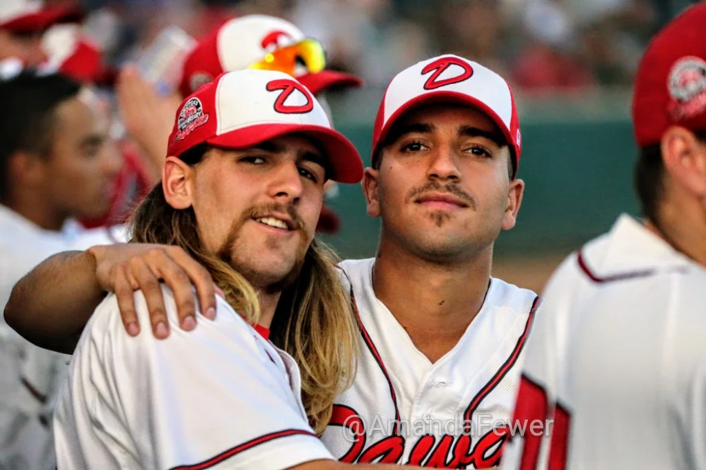 Okotoks Dawgs teammates CJ Lewington and Aderly Perez embrace in the Dawgs dugout. Photo Credit: Amanda Fewer
