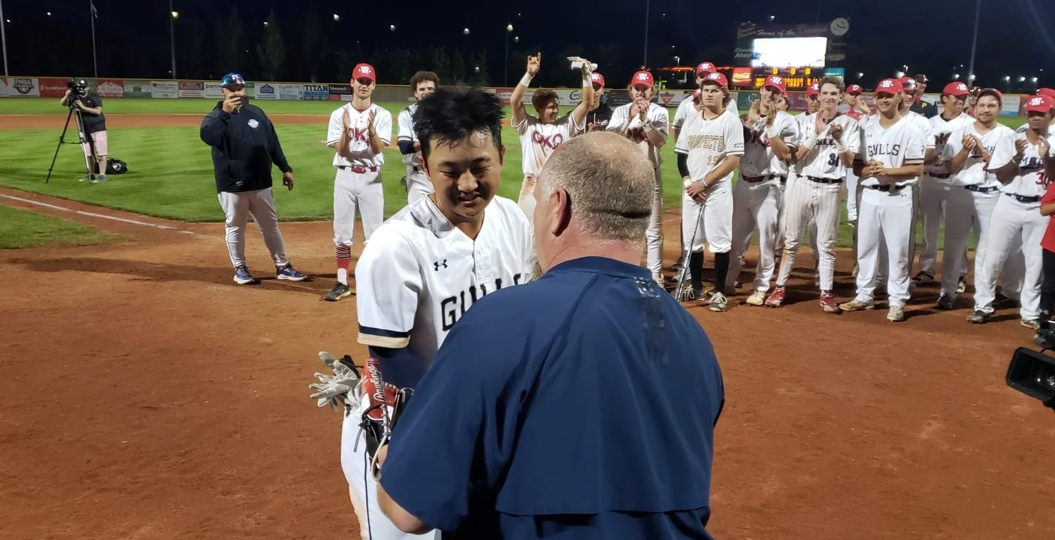 Sylan Lake Gulls infielder Ethan is shown here receiving 2022 WCBL All-Star Game MVP honours from former MLBer Matt Stairs after the game which was hosted by the Okotoks Dawgs at Seaman Stadium. The Dawgs will host the game again in 2023. Photo: Ian Wilson, Alberta Dugout Stories