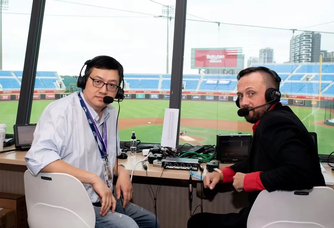 Broadcaster Wayne McNeil (Glace Bay, NS), right with Richard Wang, calling a Fubon Guardians game at Taoyuan International Stadium in Taoyuan, Taiwan.