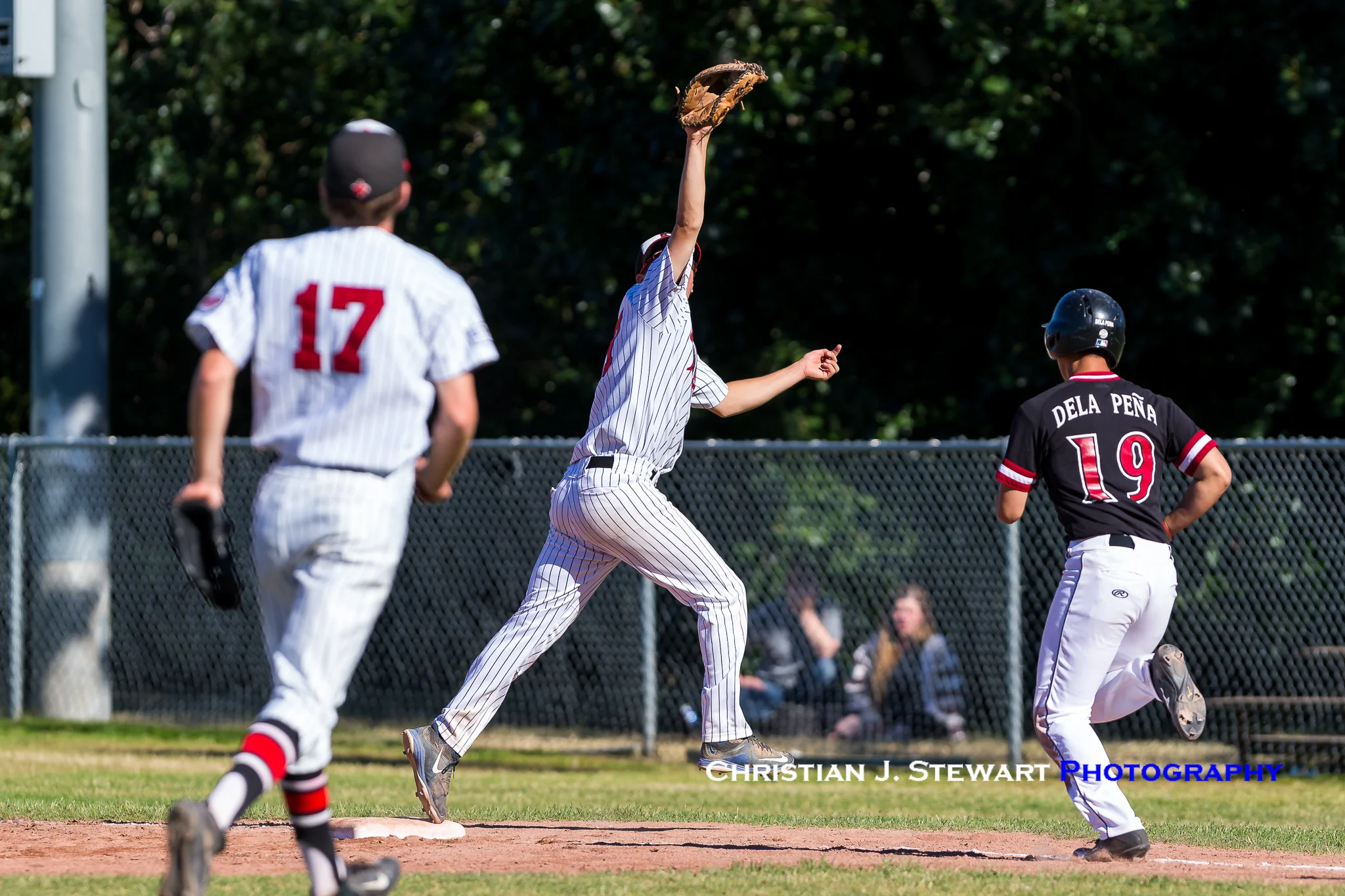 North Shore first baseman Damon Hutchings uses every inch of his 6’0″ frame to snag this throw to put out the Eagles Tony Dela Pena (Photo: Christian J. Stewart / ISN)