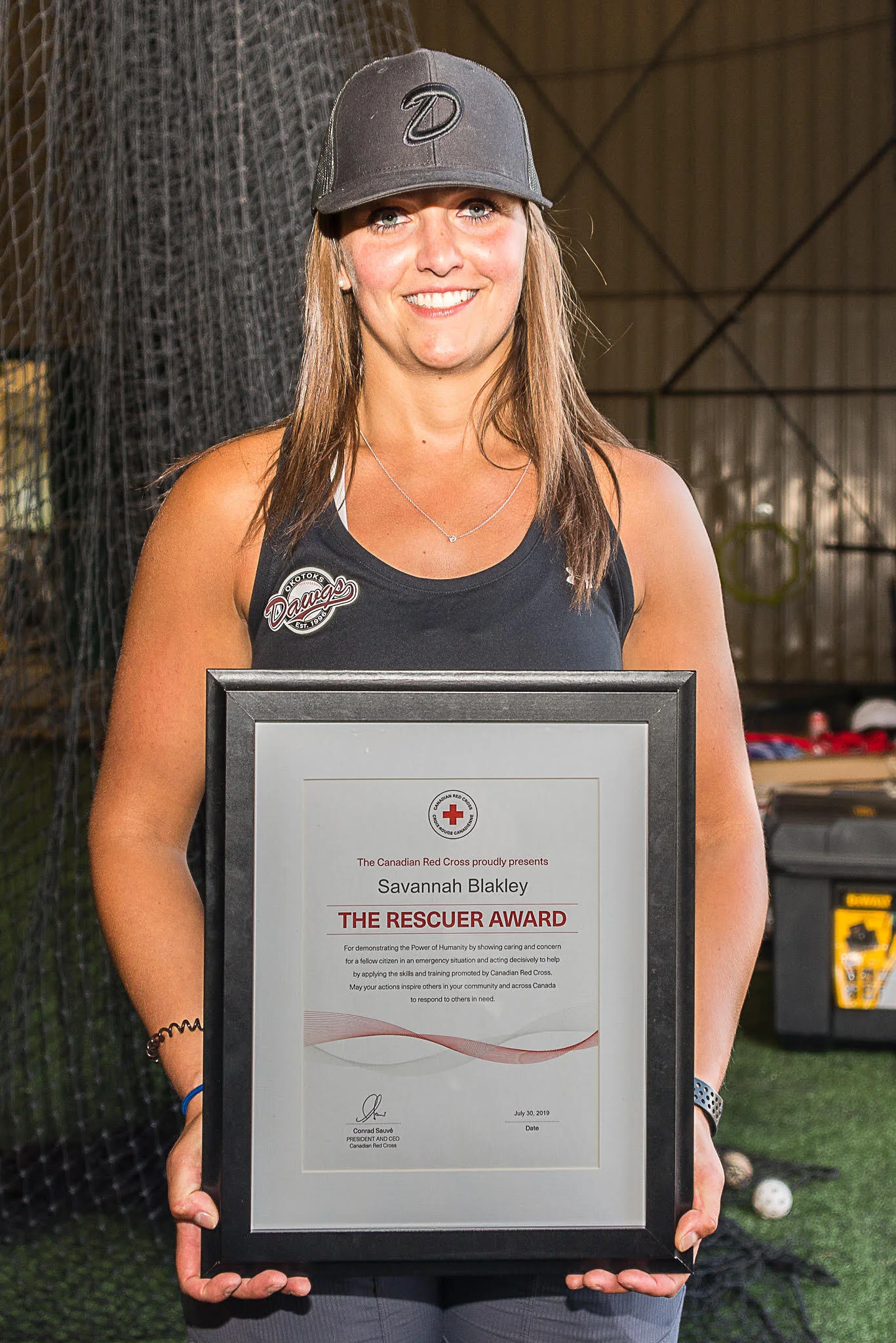 Savannah (Okotoks, Alta.)learned CPR during high school health class, attended Mount Royal University in Calgary and is re-trained often due to her job. Savannah and Angela were presented with the Red Cross Rescuer award prior to a home game on July 30. The nickname of John Ircandia’s franchise is the Dawgs, but it could easily be the Okotoks Angels. And who knows … more awards could be coming her way.