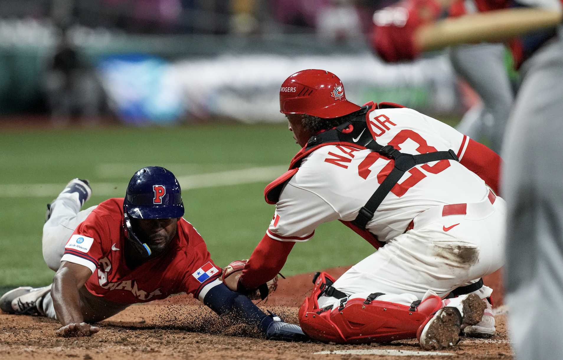 Former Ontario Blue Jays C Bo Naylor (Mississauga, Ont.) tags out a runner in a WBC win over Panama. Photo: Baseball Canada