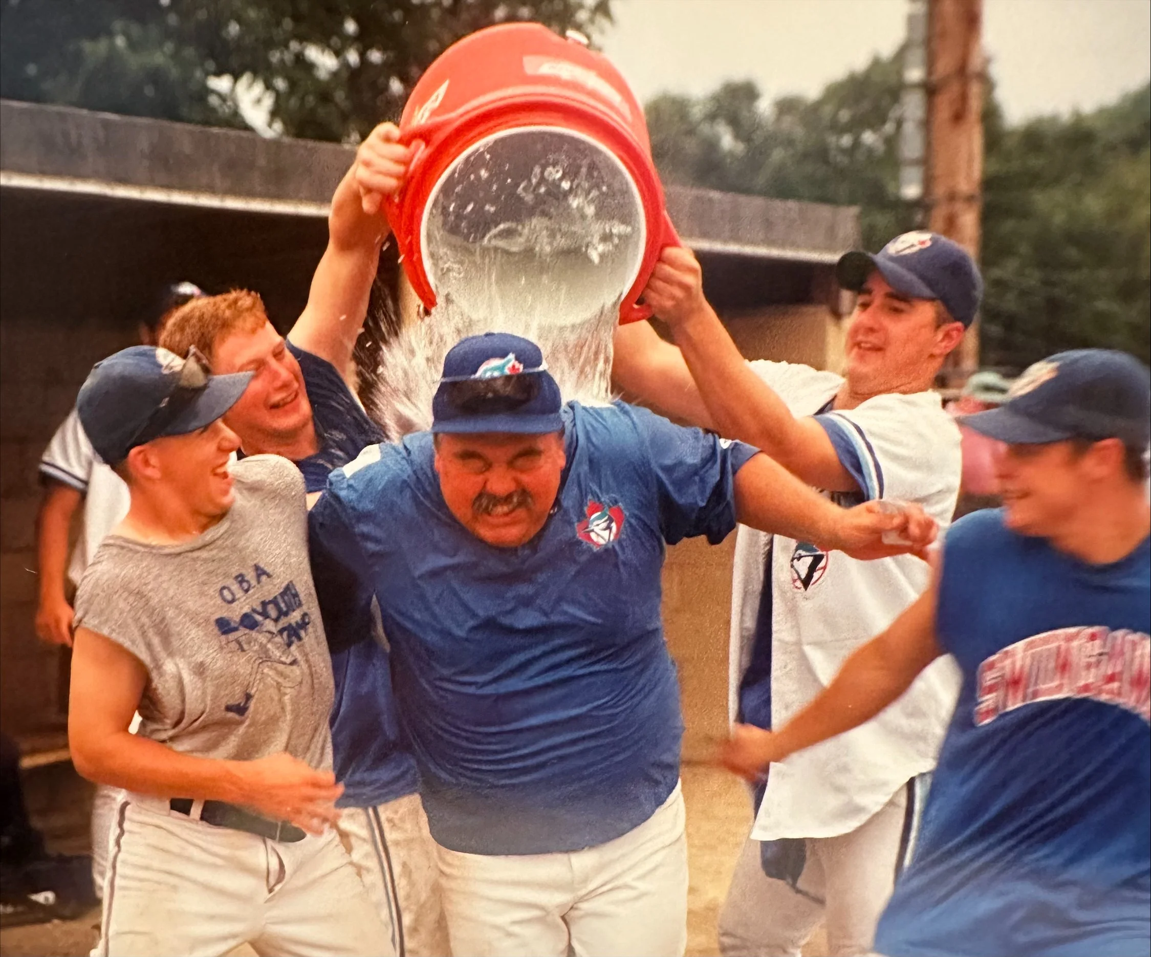 Mike Hook, grey shirt, and Matt Logan, right, doing the dumping of the Gatorade after the Ontario Blue Jays won the right to go the Connie Mack World Series in Battle Creek, Mich.