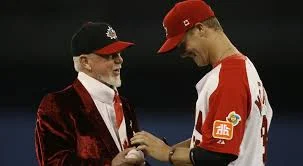 Manager Ernie Whitt (Clinton Township, Mich. a Windsor suburb) has Stubby Clapp (Windsor, Ont.), Denis Boucher (Laval, Que.), Ryan Dempster (Gibsons, BC) and Larry Walker (Maple Ridge, BC), Canada’s greatest hitter and Greg Hamilton (Ottawa, Ont.) on his staff. Dempster was the anchor of our Canada Day team for 13 consecutive years, including six opening day starting assignments.