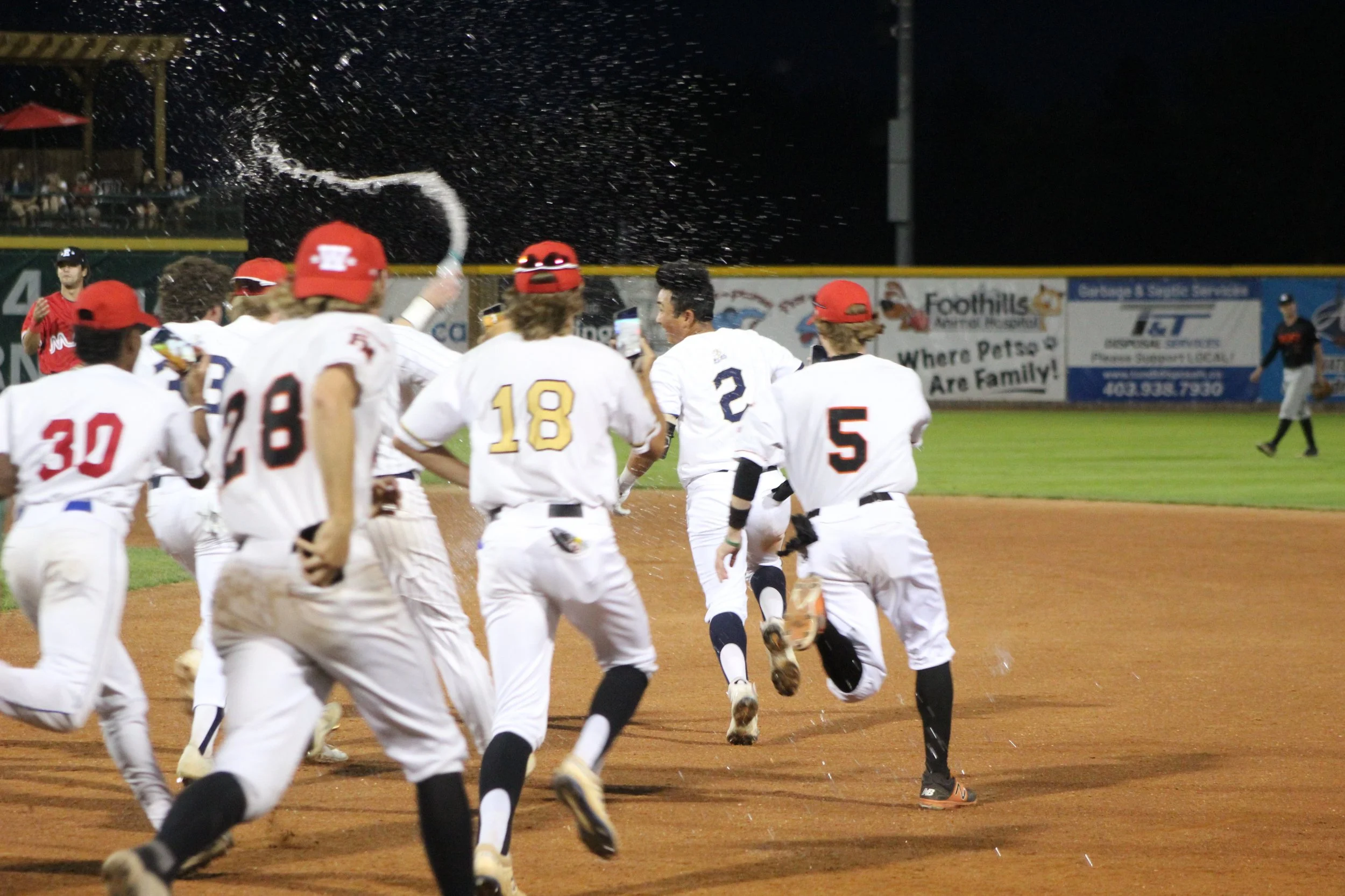 Sylvan Lake Gulls infielder Ethan He (No. 2 in the photo) being chased by his West All-Star teammates after delivering a walk-off hit in the Western Canadian Baseball League All-Star Game on Saturday night. Photo: Nathan Reiter