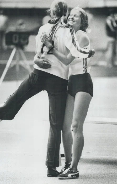 Louise Walker; left; hugs Julie White after both qualified for the Montreal Olympics. Photo: Dick Loek.