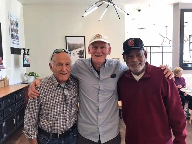 Three BC legends, from left, Luigi Derosa (Trail, BC), who turned 88 years young in September, John Haar (Vancouver, BC) who will be 79 next month and Ossie Chavarria (Burnaby, BC) 86 in August. The trio gathered at Caffè Artigiano, in Burnaby for some ‘ball talk.’ Photo: Taken by an employee of the Caffè.