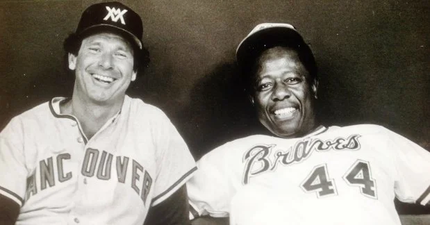 Wayne Norton (left), as a member of the Vancouver Mounties, shown here with Henry Aaron.