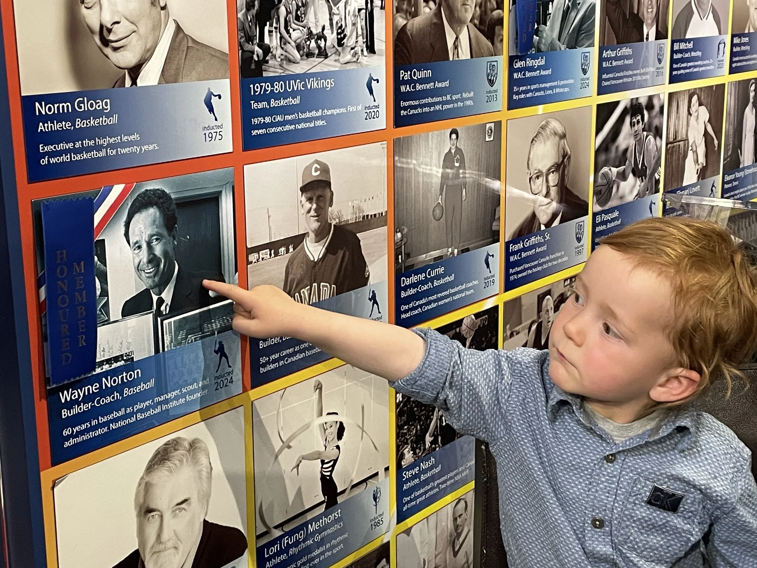 Wayne Norton's great-grandson Theo points at his plaque on the day of his B.C. Sports Hall of Fame induction.
