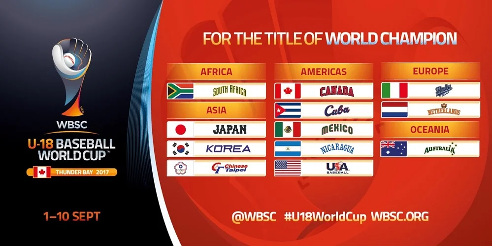 OTTAWA - The World Baseball Softball Confederation (WBSC) announced today the 12-participating nations and groups for the 2017 WBSC U-18 Baseball World Cup that will take place in Thunder Bay, Ontario from September 1-10.