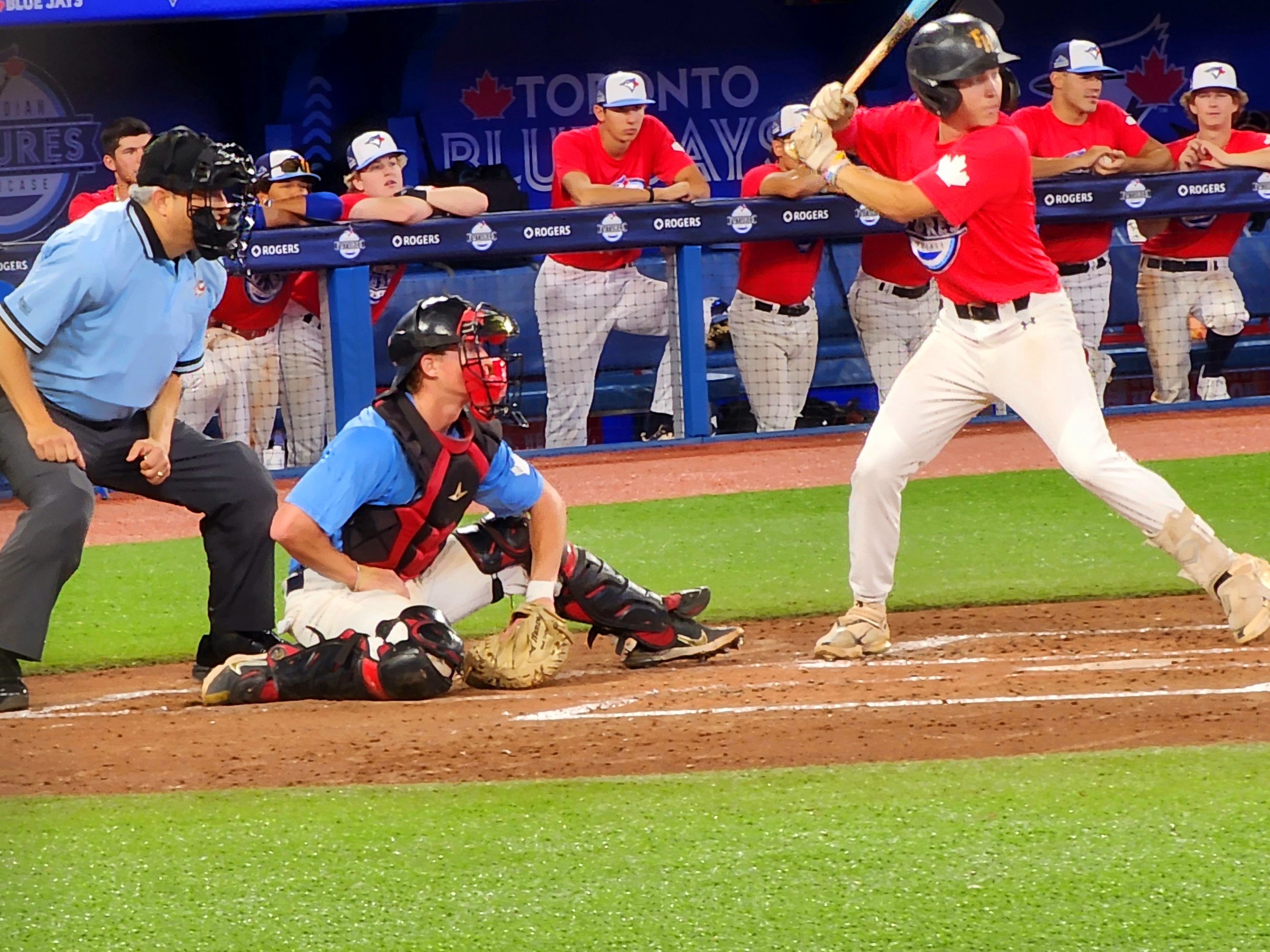 The switch-hitting catcher representing the Webber Wildcats of Alberta is so much more than what he’s listed as on this year’s Canadian Futures Showcase program. As his Team New Blue took to the diamond today against Team Red, one thing was immediately noticeable.