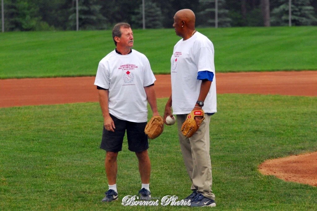 Former Chatham neighbours and ex-big league pitchers Bill Atkinson and Fergie Jenkins have been lifelong friends. Here they are conferring at a celebrity slo-pitch game at the Canadian Baseball Hall of Fame in St. Marys, Ont.. Photo: Canadian Baseball Hall of Fame