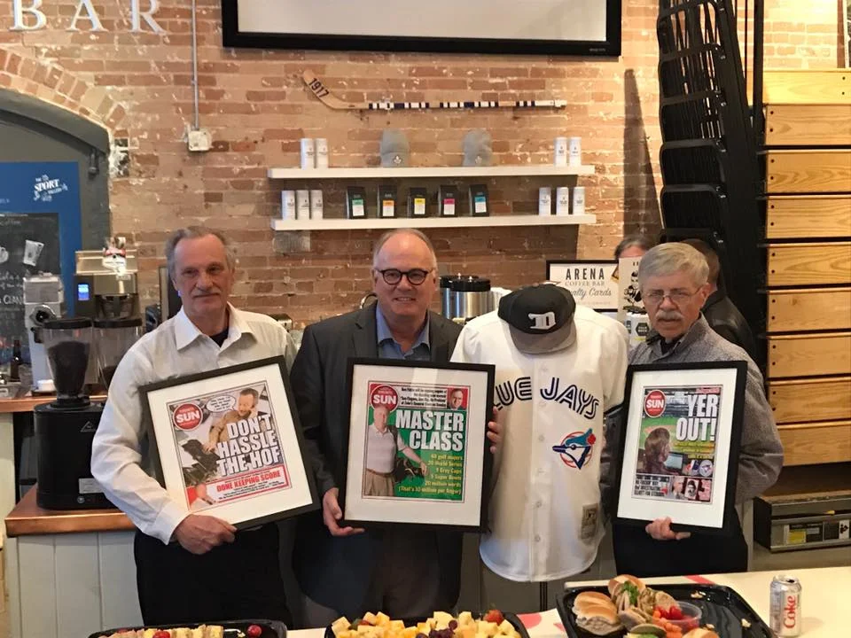 Former Toronto Sun baseball scribes, from left to right Bill Lankhof, Ken Fidlin, a mannequin subbing for absent Mike Rutsey and some other guy, were toasted at The SPORT Gallery in Distillery area, owned by former Sun sports editor Wayne Parrish. Former bosses Mike Simpson, Jim O’Leary, Scotty Morrison, and Pat Grier were on hand for the event, hosted by Lance Hornby.
