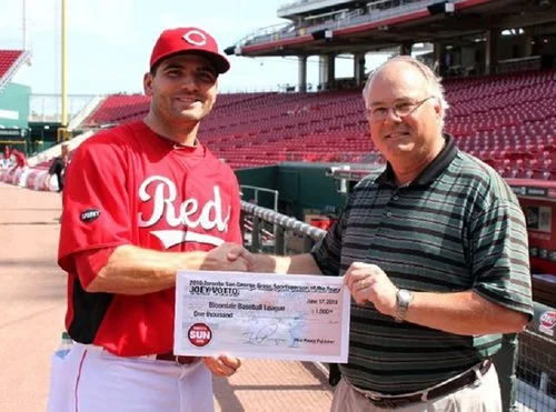 Joey Votto being presented the Toronto Sun sportsman of the year award by Ken Fidlin at Great American Ballpark.