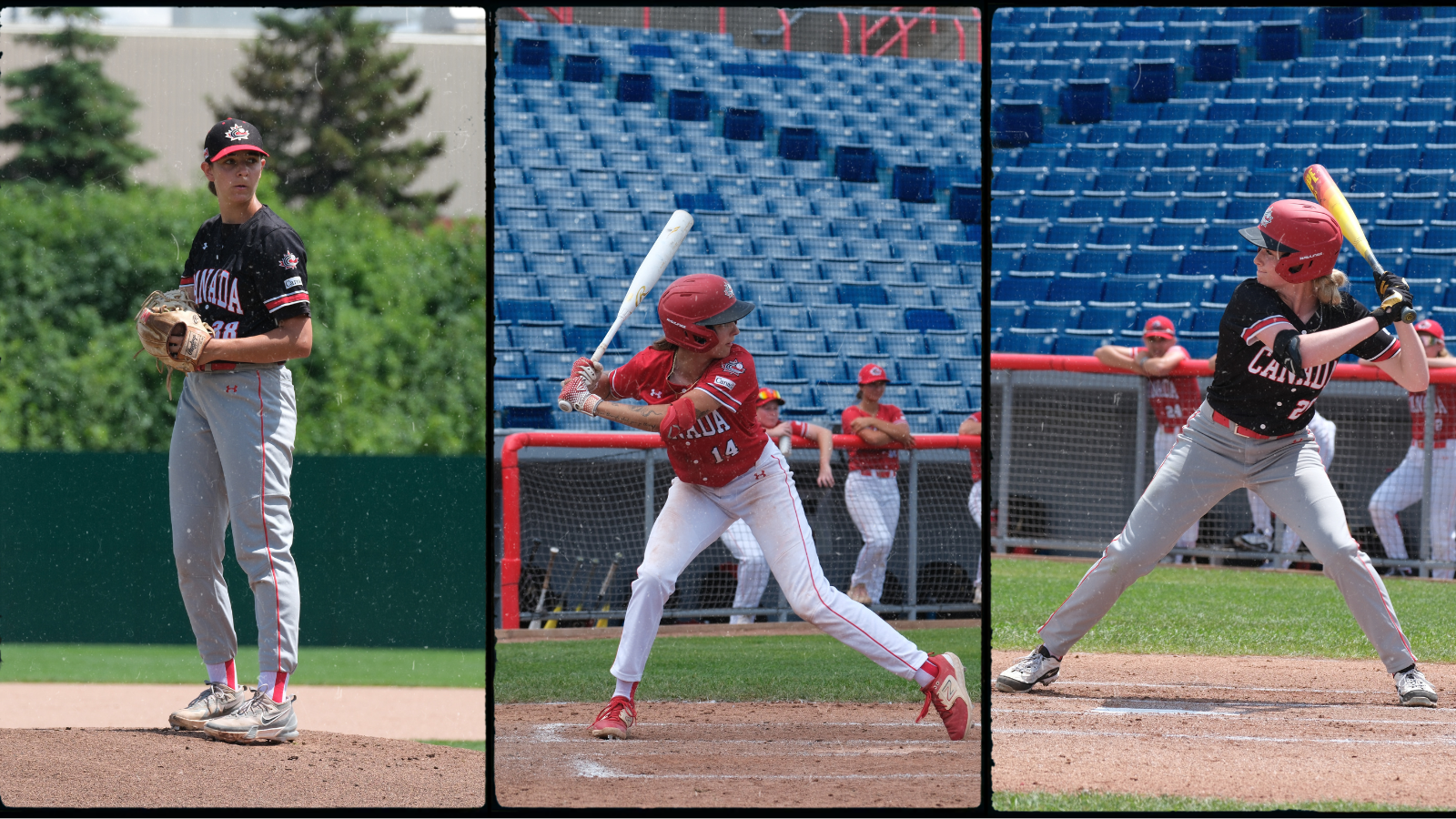 Left to right: Alexane Fournier (St-Jean-sur-Richelieu, Que.), Kaitlyn Ross (Redcliff, Alta.) and Ava Greiner (Stettler, Alta.). Photo: Baseball Canada