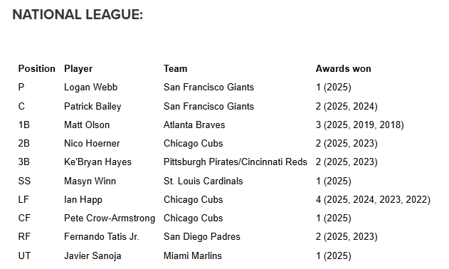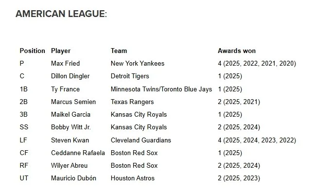 Below is the complete listing of the 2025 Rawlings Gold Glove Award winners from each league and the number of Rawlings Gold Glove Awards each player has won in his career: