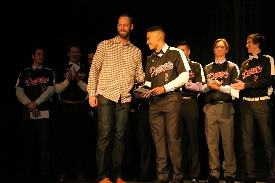 Chicago Cubs RP Jimmy Henderson (Calgary, Alta.), an original Dawg, presents the Jimmy Henderson award to OF Danny Donnelly (Okotoks). Photo: Amanda Fewer.