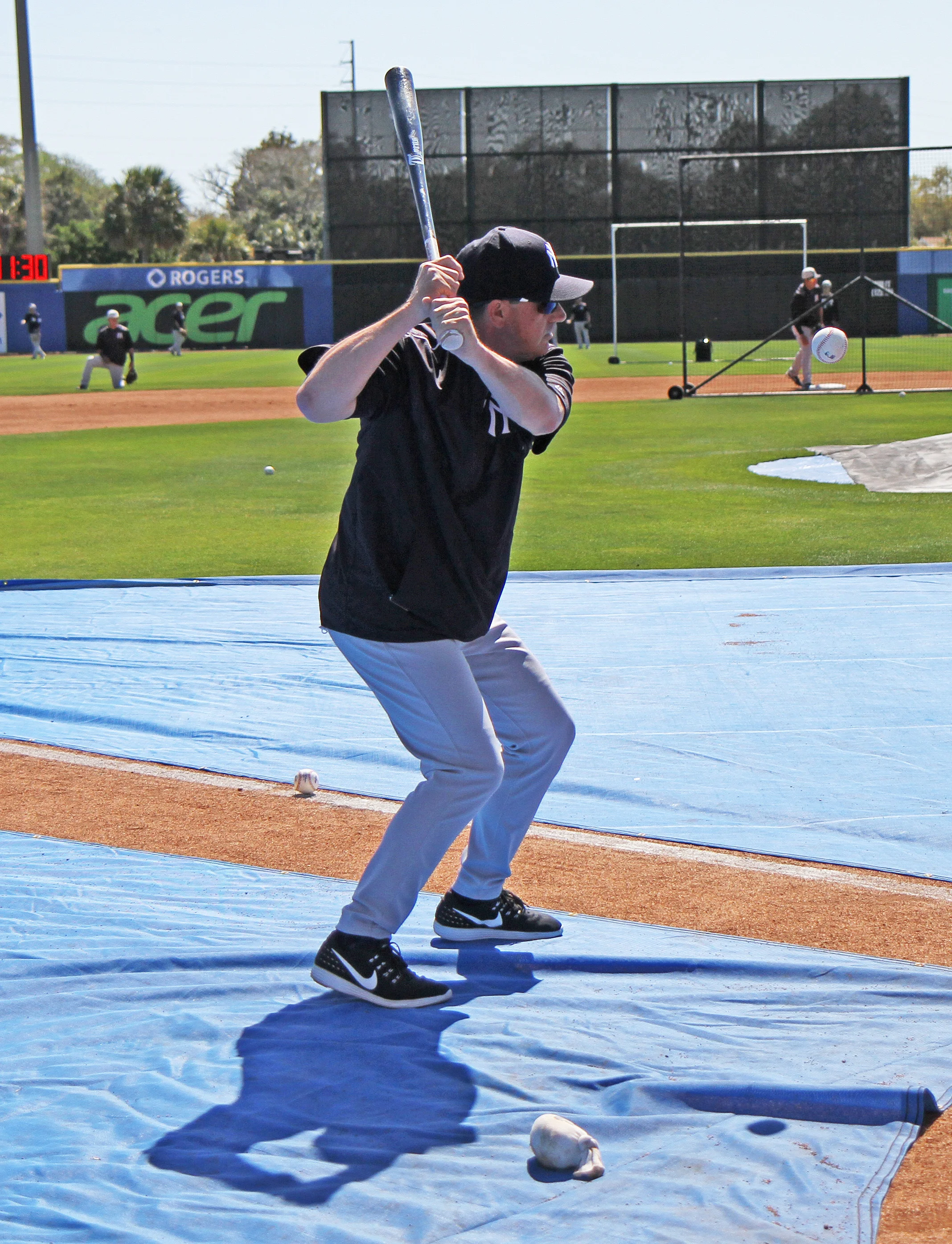 Prior to this spring training game in Dunedin, Fla., Thomson helped out by hitting grounders to Yankees infielders during batting practice. PHOTO: MATT ANTONACCI