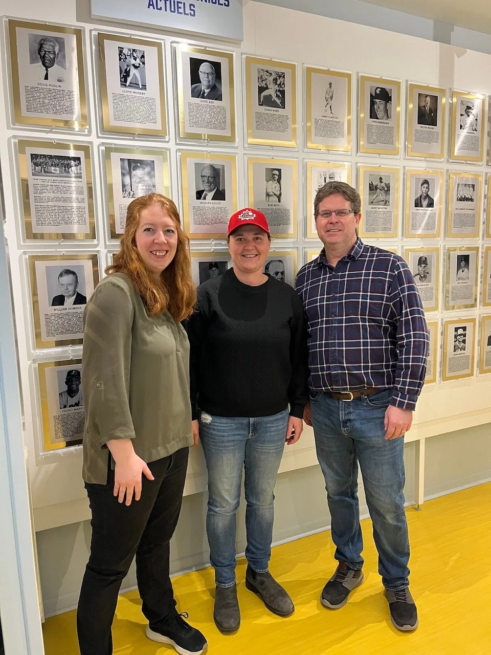 Women’s national team legend and 2026 Canadian Baseball Hall of Fame inductee Kate Psota (Burlington, Ont.), middle, visited the Canadian ball hall in St. Marys, Ont., on Thursday. She is shown here with Lindsay Earle, the Hall’s care of collections and public engagement supervisor and Scott Crawford, the Hall’s director of operations. Photo: Canadian Baseball Hall of Fame