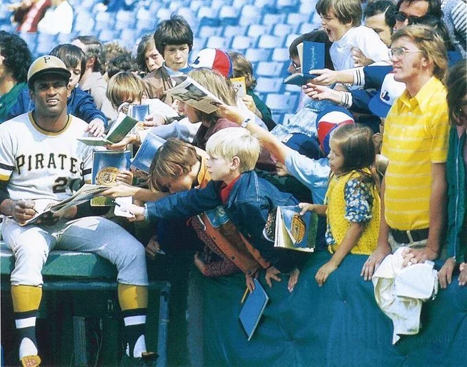 Roberto Clemente signs autographs for young fans at Montreal’s Jarry Park. Photo: Denis Brodeur