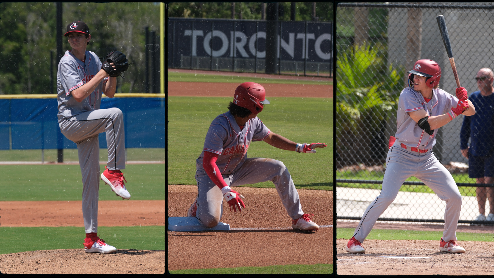 From left to right: Victoria Mariners’ LHP Reid Clague (Victoria, BC), Mississauga Tigers’ INF Tommy Hanger (Toronto, Ont.) and Okotoks Dawgs INF Eric Hartman (St. Albert, Alta.). Photo: Baseball Canada