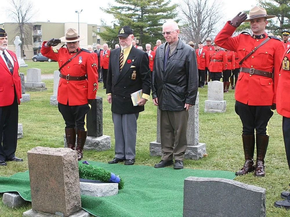Royal Canadian Mounted Police Sgt. Mark Howard, left, and Const. Todd Sparkes, right, salute as Don Cherry and his brother Dick step back after placing a wreath on the gravestone of their late grandfather, John T. Cherry, who was one of the original 300 members of the Northwest Mounted Police. A ceremony Wed., Nov. 16, 2011 at St. Mary’s Cemetery in Kingston, Ont. dedicated a regimental stone in his name. Photo by Michael Lea/Kingston Whig-Standard/SunMedia.