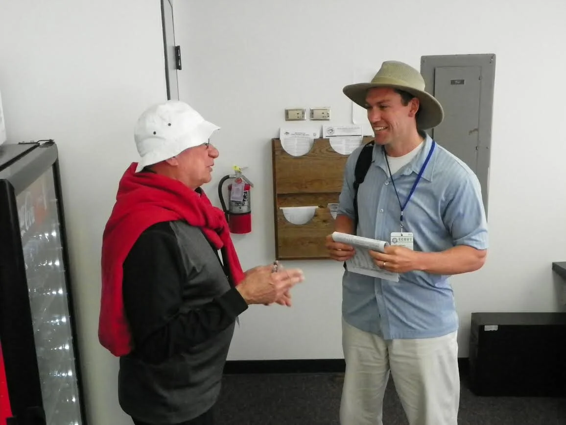 Jacques Doucet, left, chats with Florida Marlins scout Peter Bergeron (Montreal, Que.) at Granat Field Dunedin in the spring of 2014. Photo: Eddie Michels.