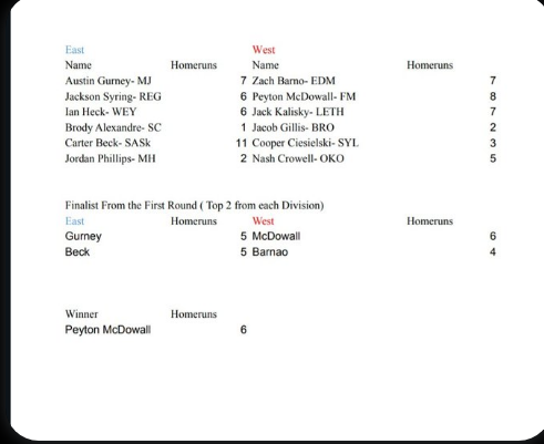 McDowall had eight home runs in the first round to advance directly to finals to represent the East Division. Meanwhile Edmonton Prospects slugger Zach Barnao and Lethbridge Bulls two-way player Jack Kalisky had to endure two tiebreakers (five swings each) before Barnao advanced to become the second East Division finalist.