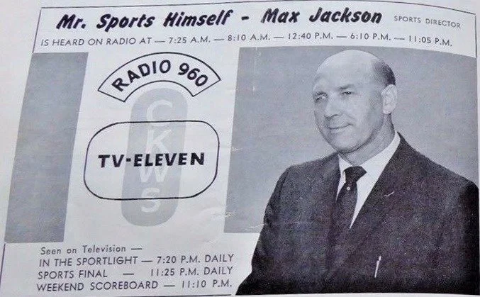 In January 1956, CKWS hired Jackson as a TV and radio sportscaster. It was the beginning of his legendary career at the station, a 26-year run that lasted until he retired in 1982. A few months after Max started at the station, CKWS hired his son, Maurie Jackson, then, 16. Maurie left high school at Queen Elizabeth high school to take a job for $25 a week, working audio for local TV broadcasts.