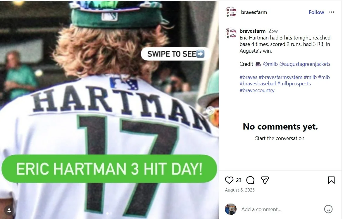 After a brief six-game stop with the Braves’ team in the Florida Complex League, Hartman returned to the GreenJackets for his first game on July 2.