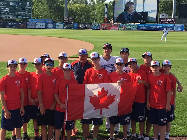 SS Daniel Pinero (Toronto, Ont.) and OF Cole Bauml (Meunster, Sask.) -- back row in white -- of the class-A West Michigan Whitecaps, entertained coach Jeff Lamont's Oakville A's minor bantams in Grand Rapids, Mich.