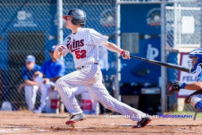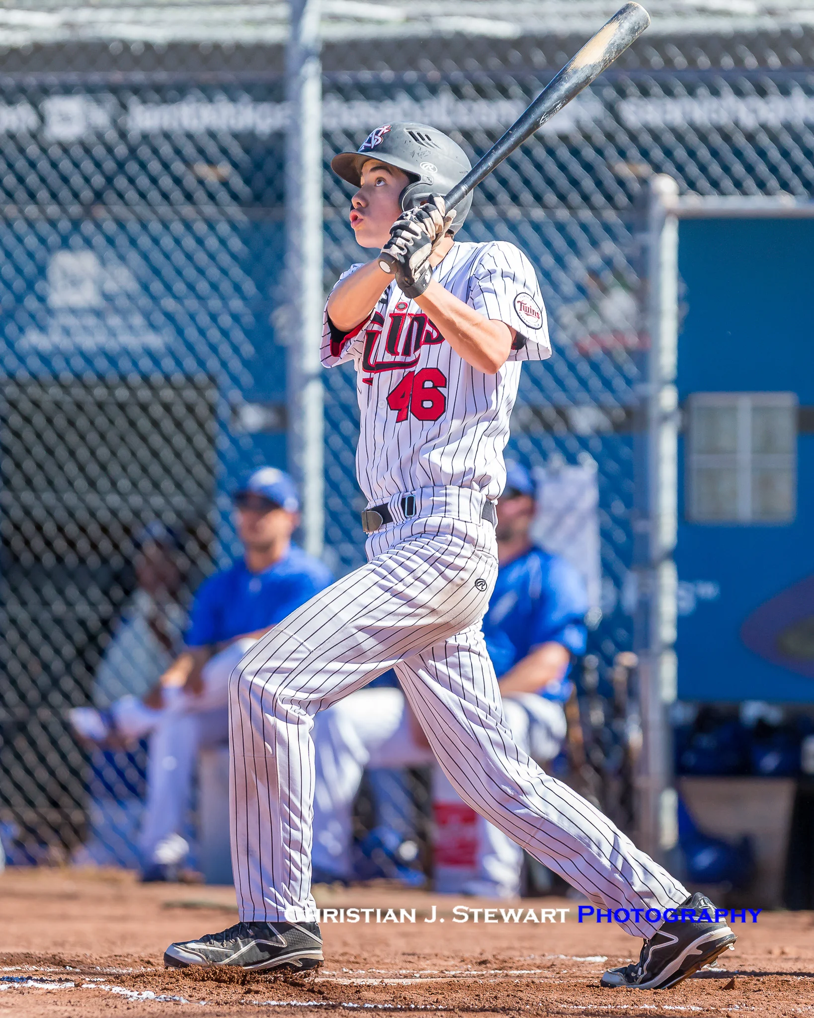 A two-run bomb in the first inning by the Twins Lucas Yang was one of eight hits in the inning, as the Twins jumped into a 6-1 lead after one (Photo: Christian J. Stewart / ISN)
