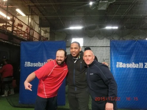 Former Blue Jays slugger Edwin Encarnacion on a visit to The Baseball Zone to see Ryan Armstrong, left and Rick Johnston.