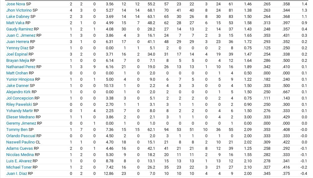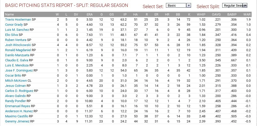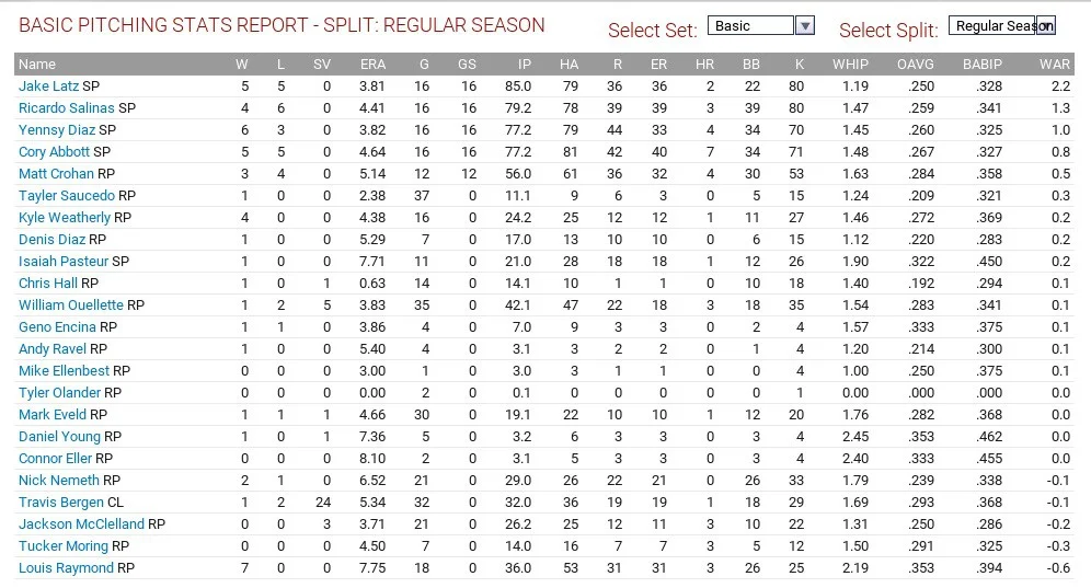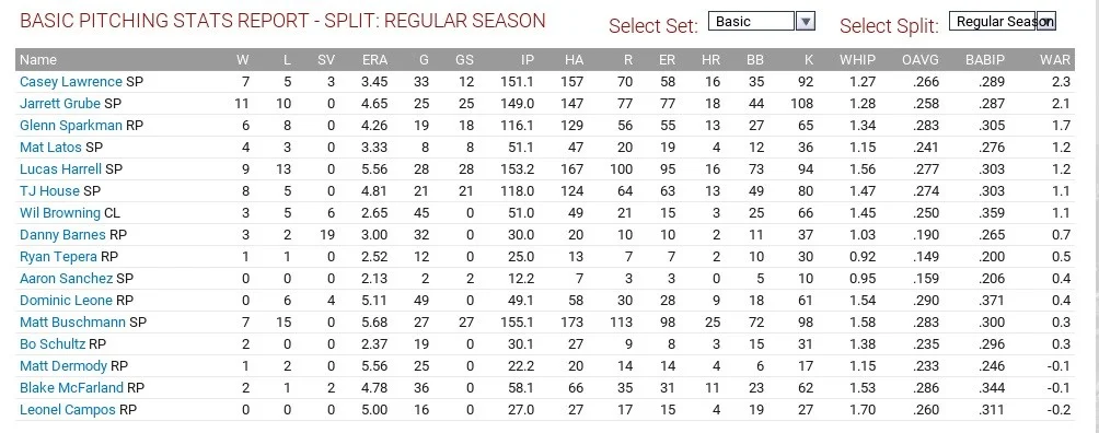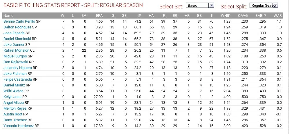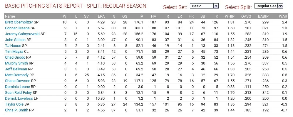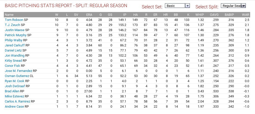 Tom Robson led the club with 2.5 WAR, throwing 149 1/3 innings with a 4.04 ERA and 1.32 WHIP, striking out 133 but Patrick Murphy had the best ERA on the club, with a 3.16 mark and 1.30 WHIP. T.J. Zeuch also had 10 wins but a 4.80 ERA and 1.37 WHIP and led the team with 136 strikeouts. Justin Maese had a 4.79 ERA and 1.46 WHIP, striking out 116 in 146 2/3 innings.