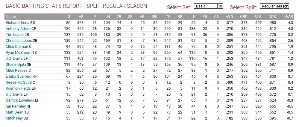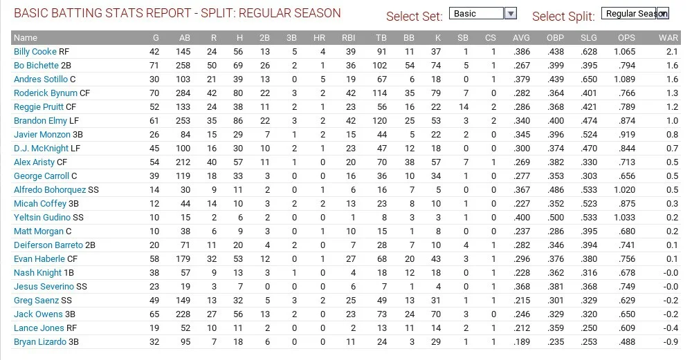 Ok, so the game automatically assigned all of the draftees (aside from those taken in the first five rounds) to the DSL and there were a couple of college-age draftees whom I forgot to move to another team. Therefore, we got Chase Hannifin, a center fielder, hitting .381/.462/.584 with eight home runs leading the way.