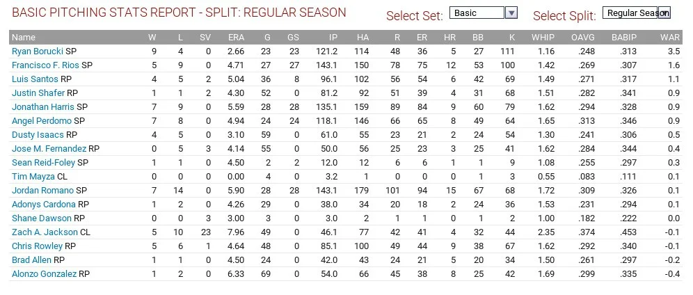 Ryan Borucki was dominant on the mound, going 9-4 with a 2.66 ERA and 1.16 WHIP, striking out 111 in 121 2/3 innings to earn 3.5 WAR. Jonathan Harris had a 5.59 ERA and Angel Perdomo had a 4.94 ERA and both had WHIPs over 1.60. Dusty Isaacs was good out of the bullpen.