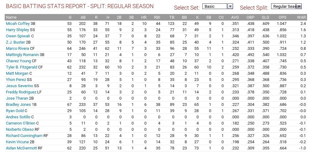 The Bluefield Blue Jays were 39-29 and finished third in their division. It was newly drafted Micah Coffey who provided the most WAR with 2.4 along with a stellar .351/.438/.609 slash line, leading the team with 10 home runs (the only player in double digits). Two other new draftees, Harry Shipley and Z.J. Buster both had OPSs over .850 with Buster coming in at .911 (.324/.411/.500) and Shipley coming in at .856 (.313/.418/.438).