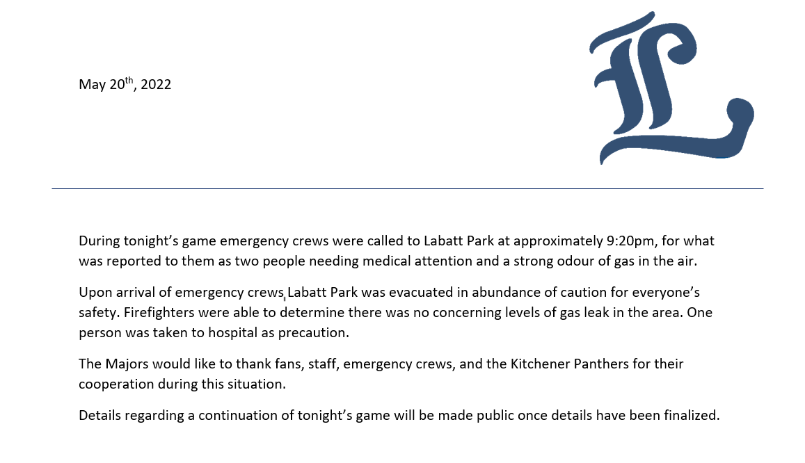 LONDON – The London Majors’ home opener on Friday was suspended in the fifth inning after a propane leak resulted in the evacuation of Labatt Park.
