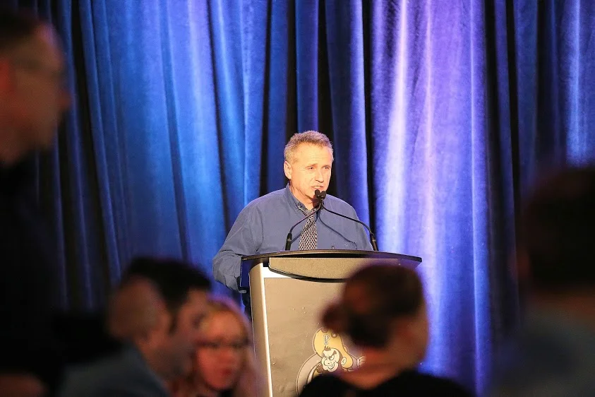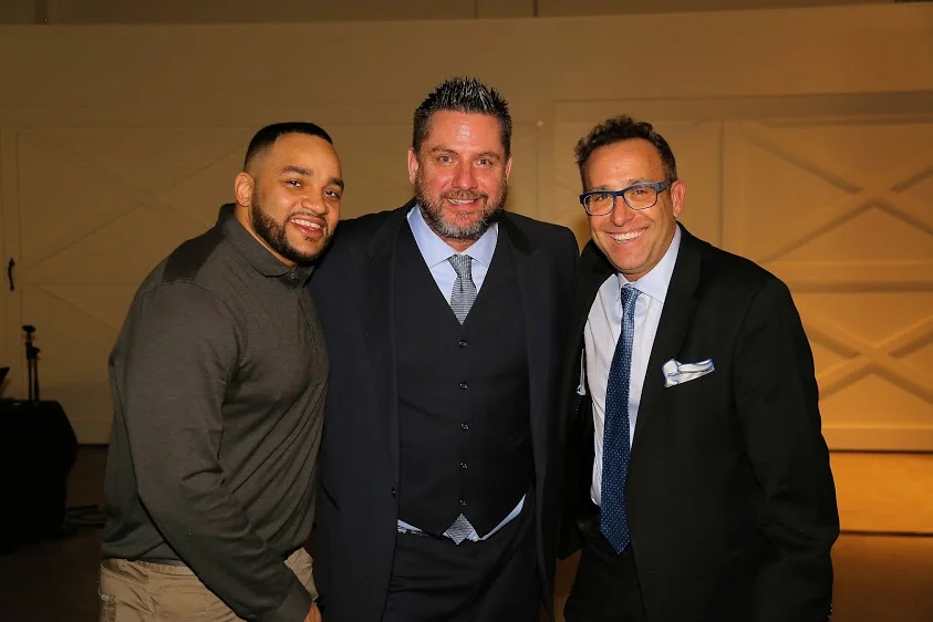 Edmonton Eskimos running back Calvin McCarty, Prospects volunteer Shawn Green and Rick Bronson MC at the first Fund raising Gala for the Edmonton WMBL team.