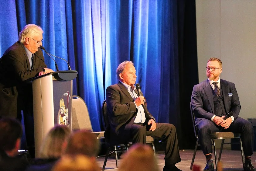 Al Coates, left, moderated a Hot Stove panel with Orv Franchuk and Jays broadcaster Gregg Zaun.